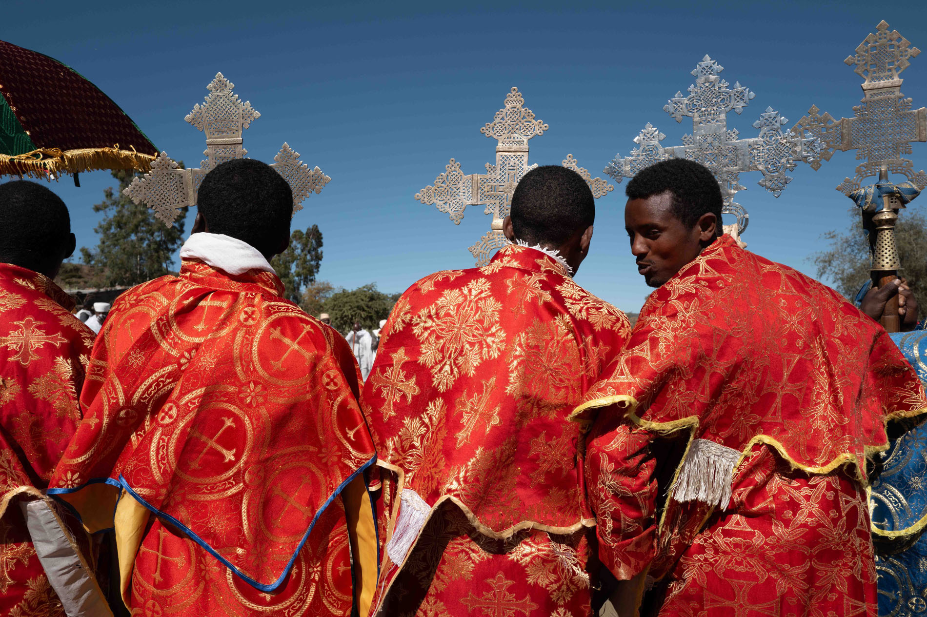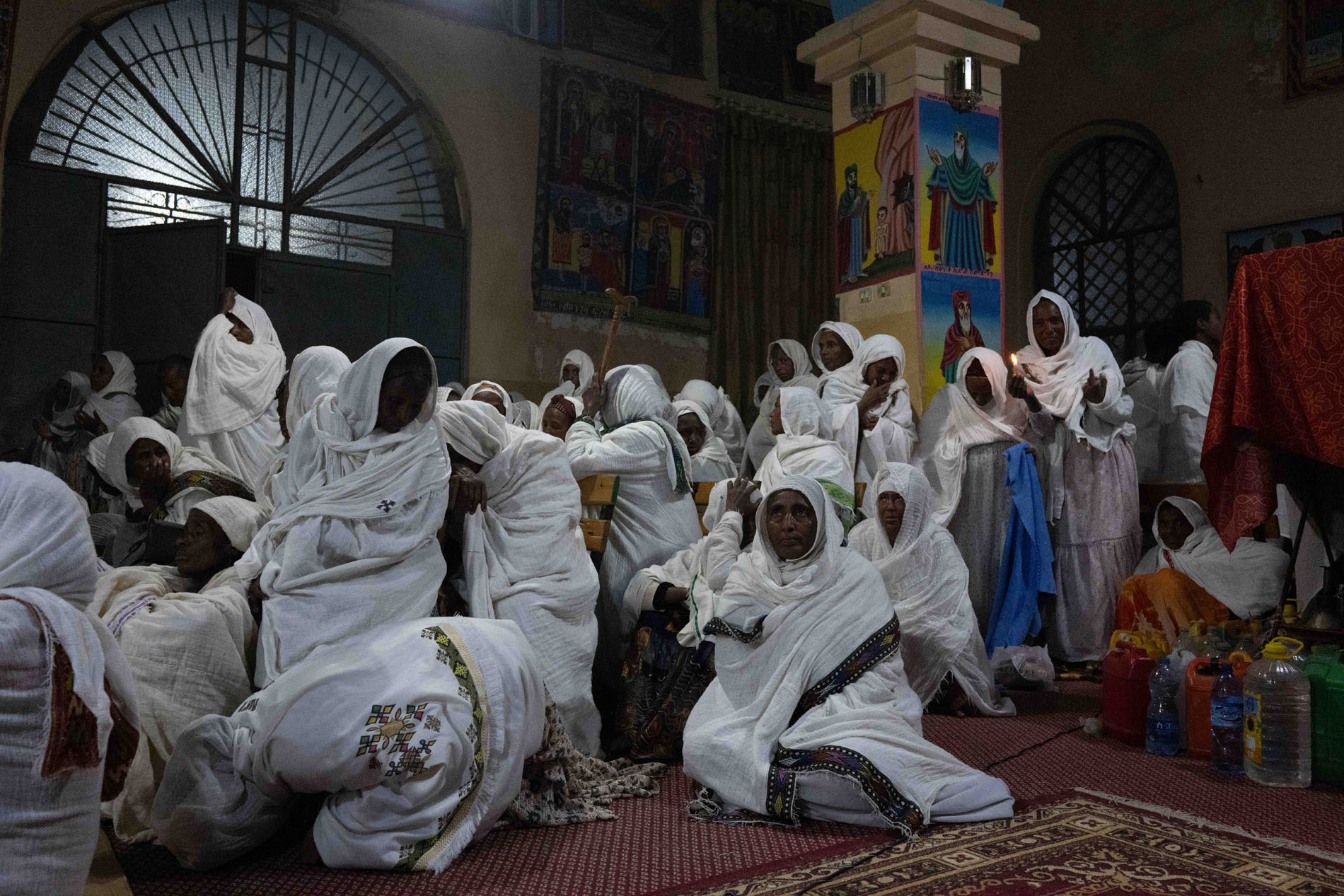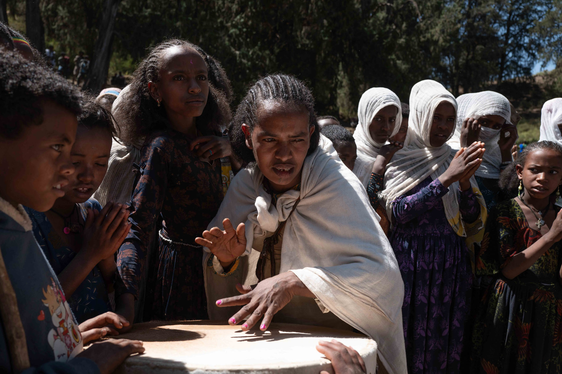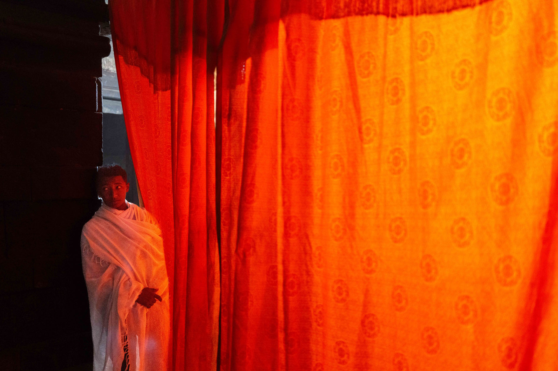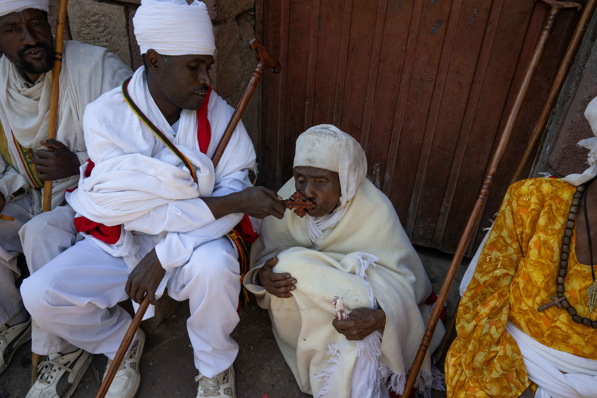 Oltre la festa, emerge la fede quotidiana. Nelle antiche chiese scavate nella roccia, i volti velati delle donne etiopi, segnati dal tempo, raccontano storie di devozione ininterrotta e sguardi che guardano all’infinito.