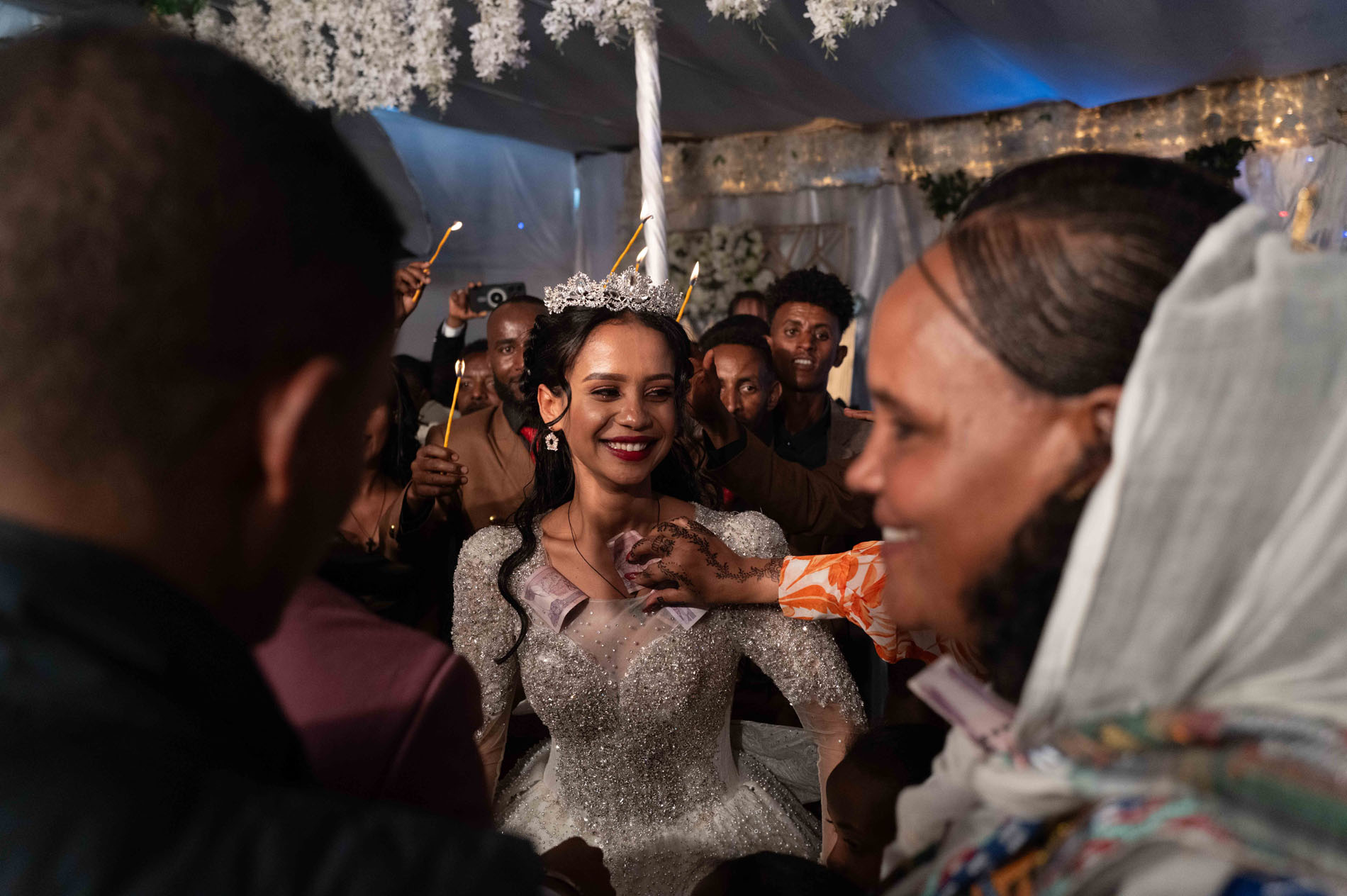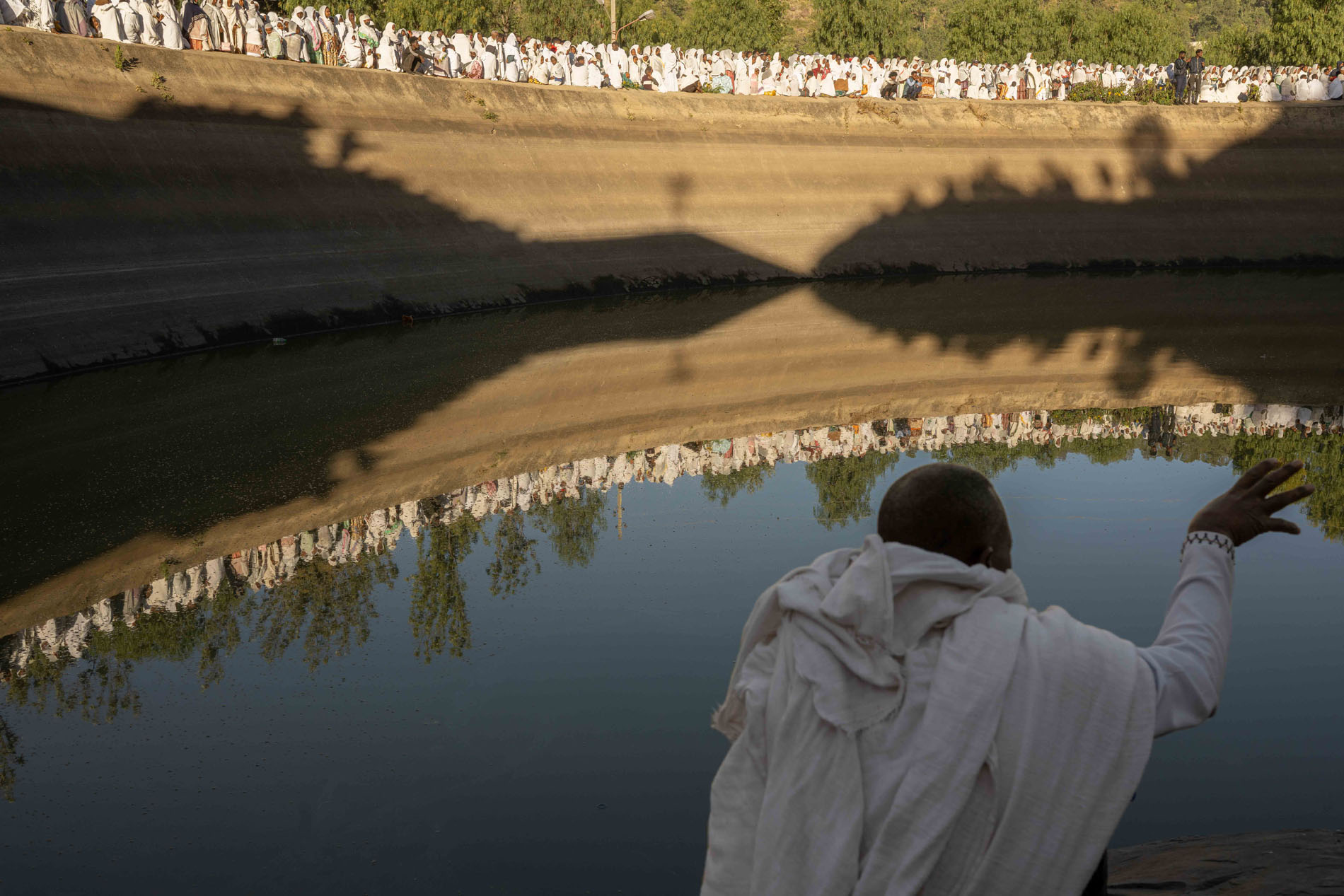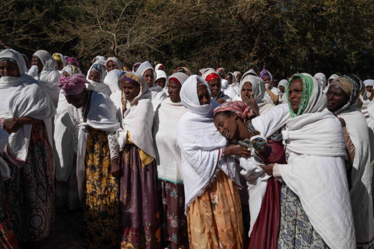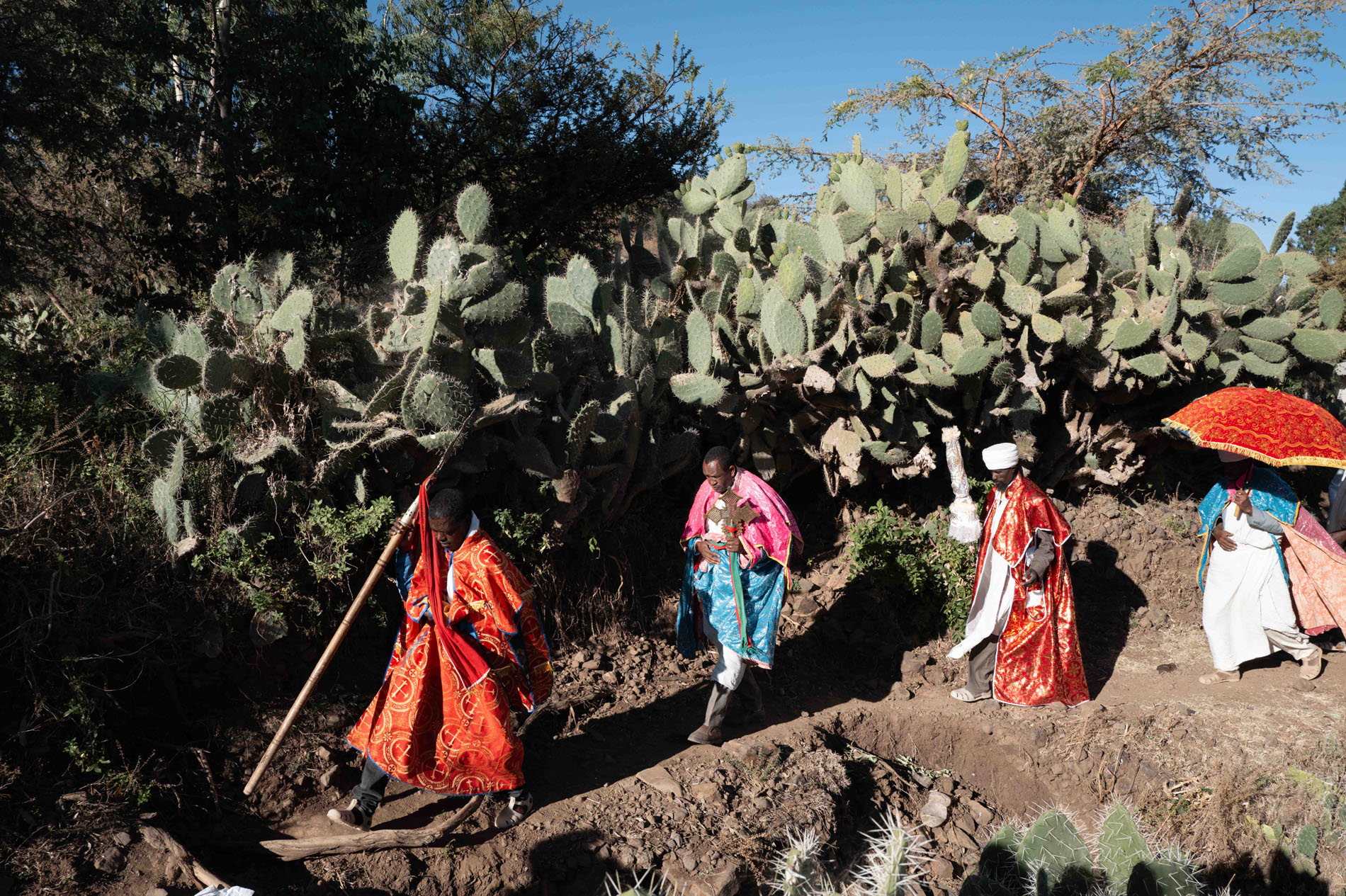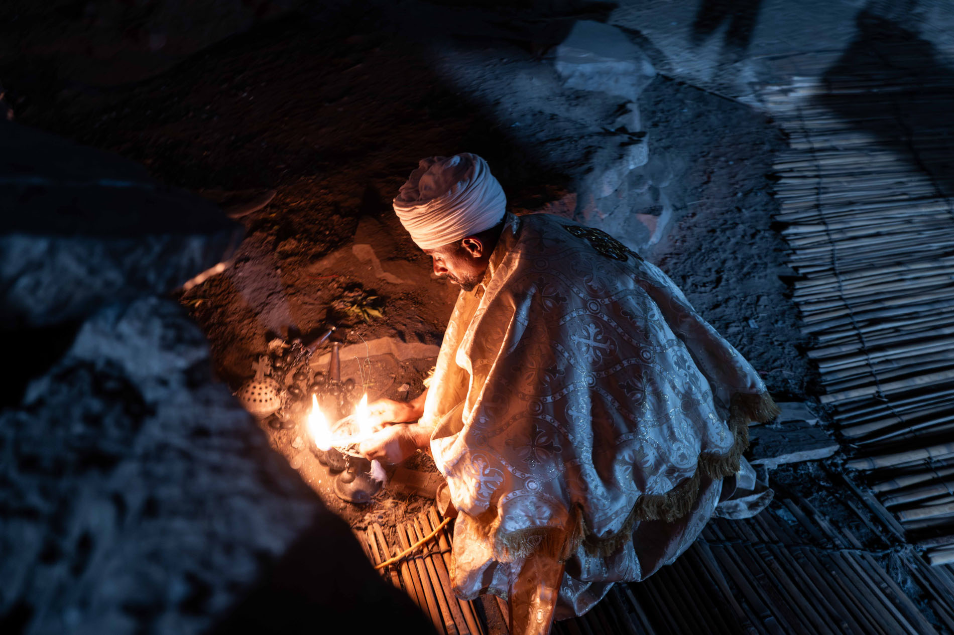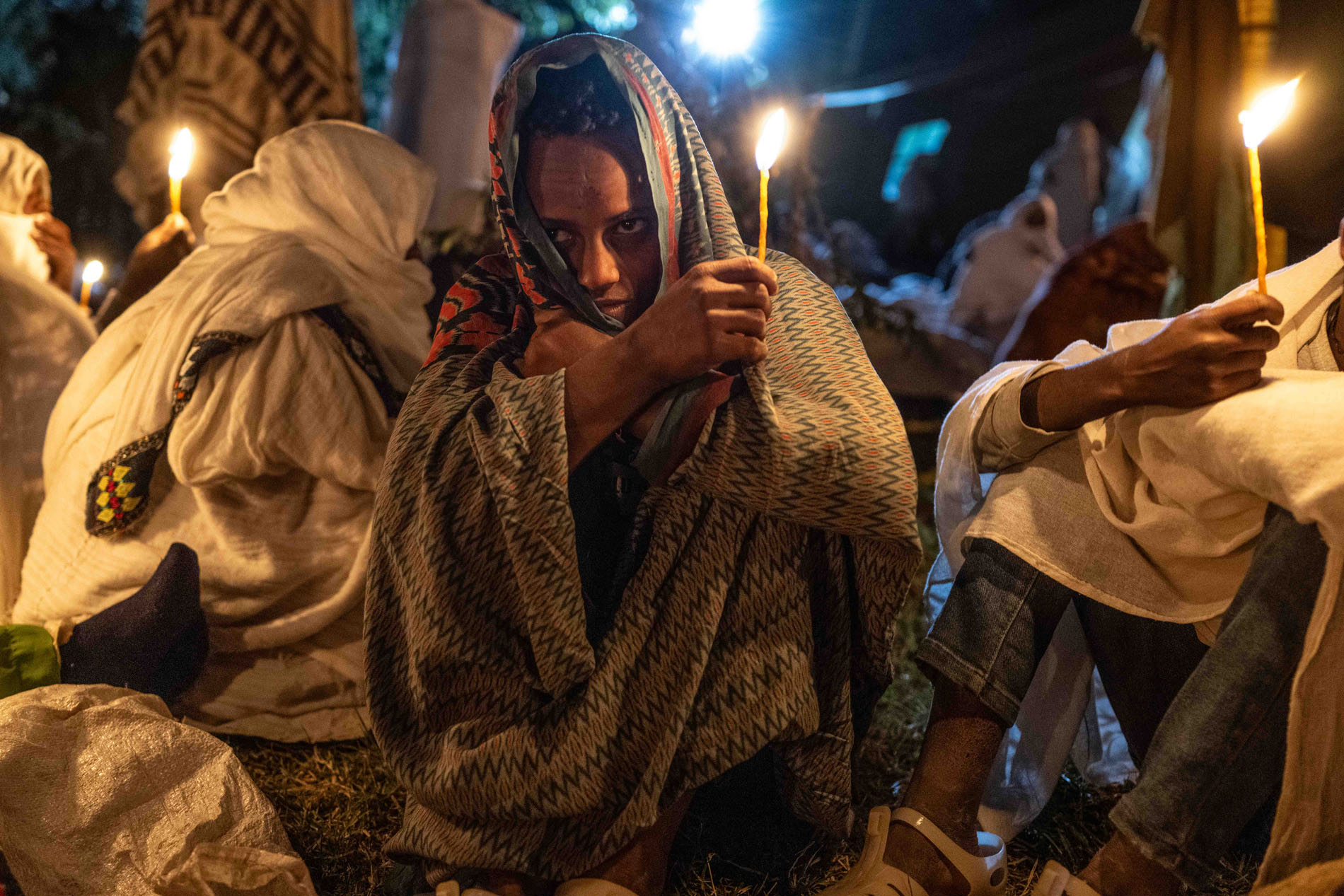 Oltre la festa, emerge la fede quotidiana. Nelle antiche chiese scavate nella roccia, i volti velati delle donne etiopi, segnati dal tempo, raccontano storie di devozione ininterrotta e sguardi che guardano all’infinito.
